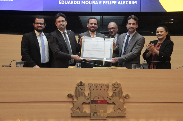 Por iniciativa dos vereadores Felipe Alecrim (Novo) e Eduardo Moura (Novo), a Câmara do Recife promoveu nesta terça-feira (30) uma reunião solene para comemorar a primeira década do Partido Novo como uma legenda política registrada oficialmente. O evento, realizado no plenário da Casa de José Mariano, reuniu políticos e correligionários do Novo. O vereador Felipe Alecrim conduziu a solenidade.